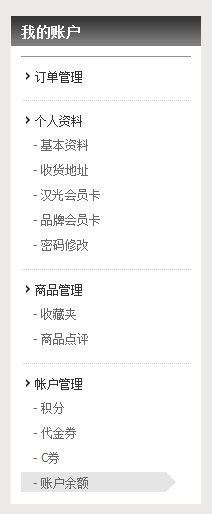 3.选择【购物卡账户】 在左侧菜单中点选【账户管理】>【账户余额】,进入您的在线购物充值账户