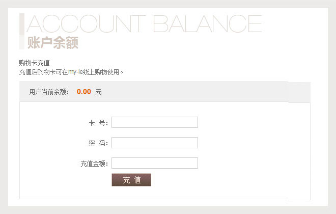 4.填写卡号/密码/金额,点击【充值】 这里将显示您的在线充值账户余额。请依次输入您的购物卡号、密码、充值金额进行充值